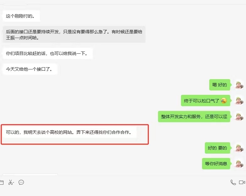 和王总认识实在今年年初朋友引荐的,当时王总遇到一个国外的项目,自己找了2个技术都搞不定,有一个还直接说了做不了,这个项目确实有一定的难度,给我们说了下功能后,我们研究了一下,是可行的。所以当时就承诺帮王总做一下技术验证,反正也不收费的。经过3天左右的测试,验证确实是可行的。后面也帮王总顺利交付了这个项目,截止到10月份,王总已经推荐了20万的开发业绩。