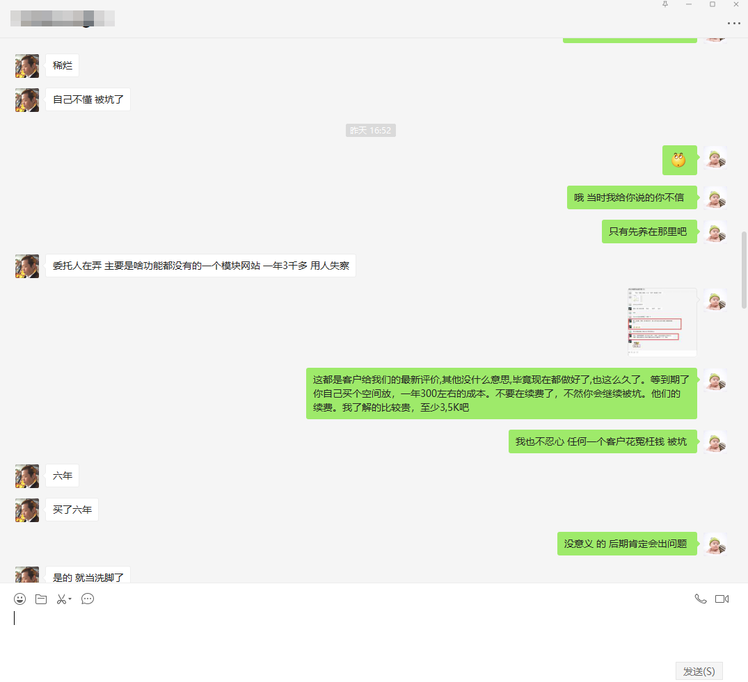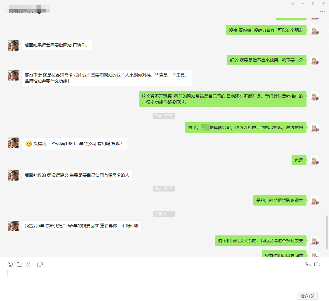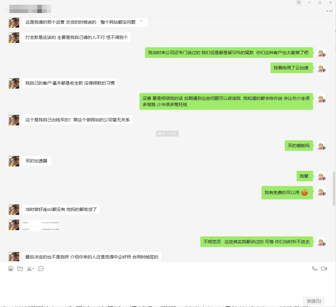 这是成都某高端定制公司老板,因为去年做网站的时候找过我,当时见过一面,后面因某种原因,选择了所谓的大公司。时隔半年左右,这又回来找到我。