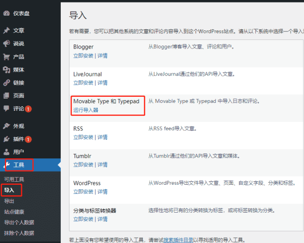 三、进入WordPress后台,进入Movable Type 和 Typepad导入器,上传刚刚从Zblog导出的TXT文件,就完成数据转换了。