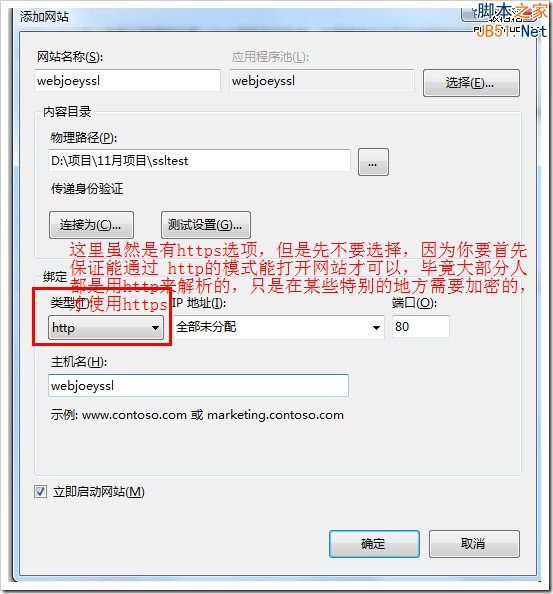 在添加的时候,绑定类型,先选择 http 的类型,虽然这里有 https,但是还是首先要保证能通过 http能访问网站,毕竟大部分的人都是通过http来打开站点的,只是在某些特别需要加密的地方用到https,我们下一步会绑定 https的,这里先不急,除非你整个站点都是https运用,那么这里才只选择https。