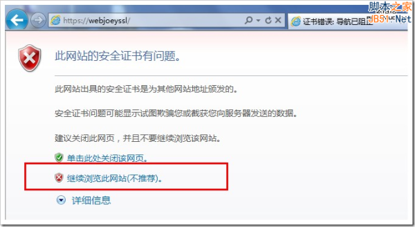 我们打开 //webjoeyssl/ 或者是 //webjoeyssl/ 会提示不安全,点击继续浏览即可。在实际的环境中,你拿到的是一个实际的证书,所以不会产生类似的报告安全证书有问题、