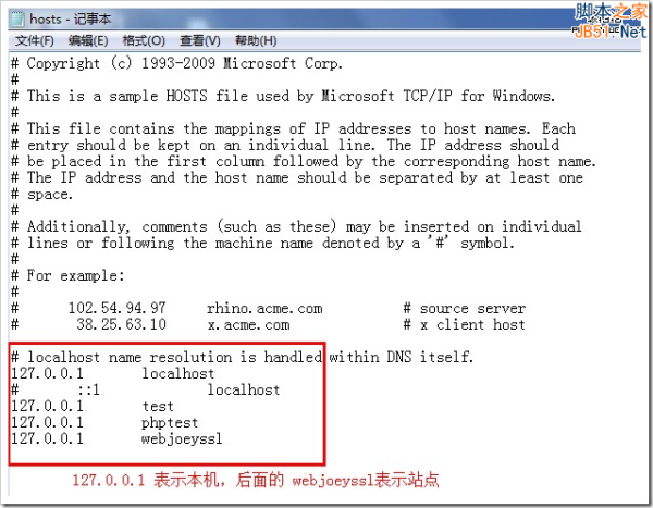 打开 hosts 文件,用于创建一个站点的名称(例如 //webjoeyssl 那么这个 webjoeyssl 就是我们需要创建的站点名称,我用hosts解析为本地)