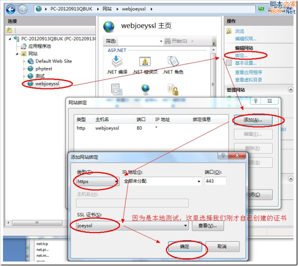 接下来,我们新建一个本地测试站点,并且绑定刚才我们创建的证书。