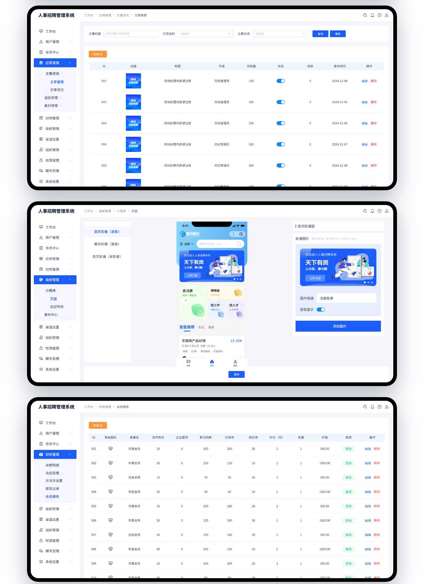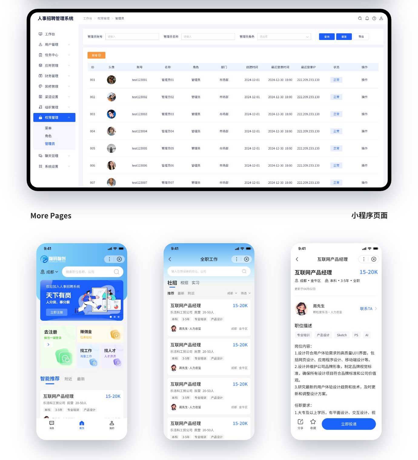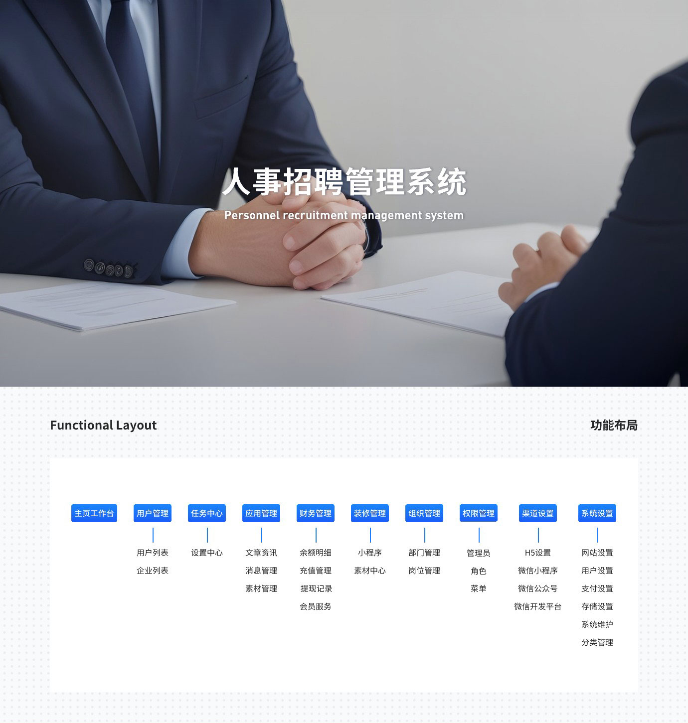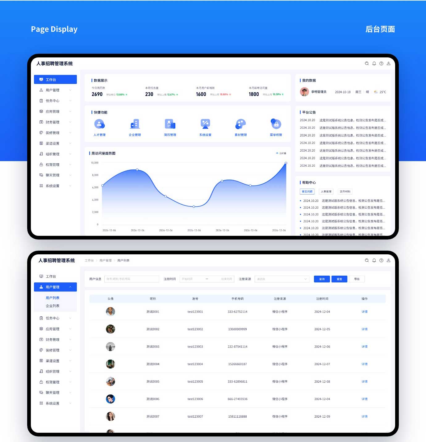 这是我们为客户定制开发的一套人事招聘管理系统,出了常规的招聘功能之外,还有任务管理系统,企业可以发布一些任务,用户可以根据任务情况提交申请,管理员进行审核,审核通过后做完任务后可以拿到一定的佣金。然后可以对佣金进行提现。