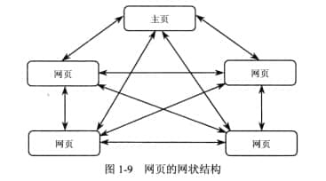 网状结构的网页组织形式如图1-9所示,方便浏览者获取信息,随时到达自己喜欢的页面。但是因为链接太多,观众很容易迷路。