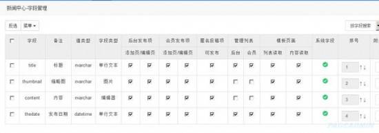 5、新添加的信息表默认会有4个字段,标题,缩列图,内容,和日期,点击字段进入字段管理界面。