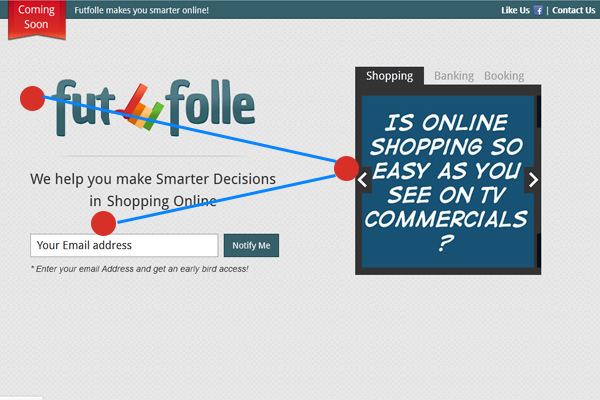 好的视觉层次。首先,顶部的“即将来临”的红色缎带很引人注目。其次,标志也很鲜明。现在,跟随我之前提到的“之”字形,访问者看到右半部分的图片滑块,最后,到达电子邮件提交表格。